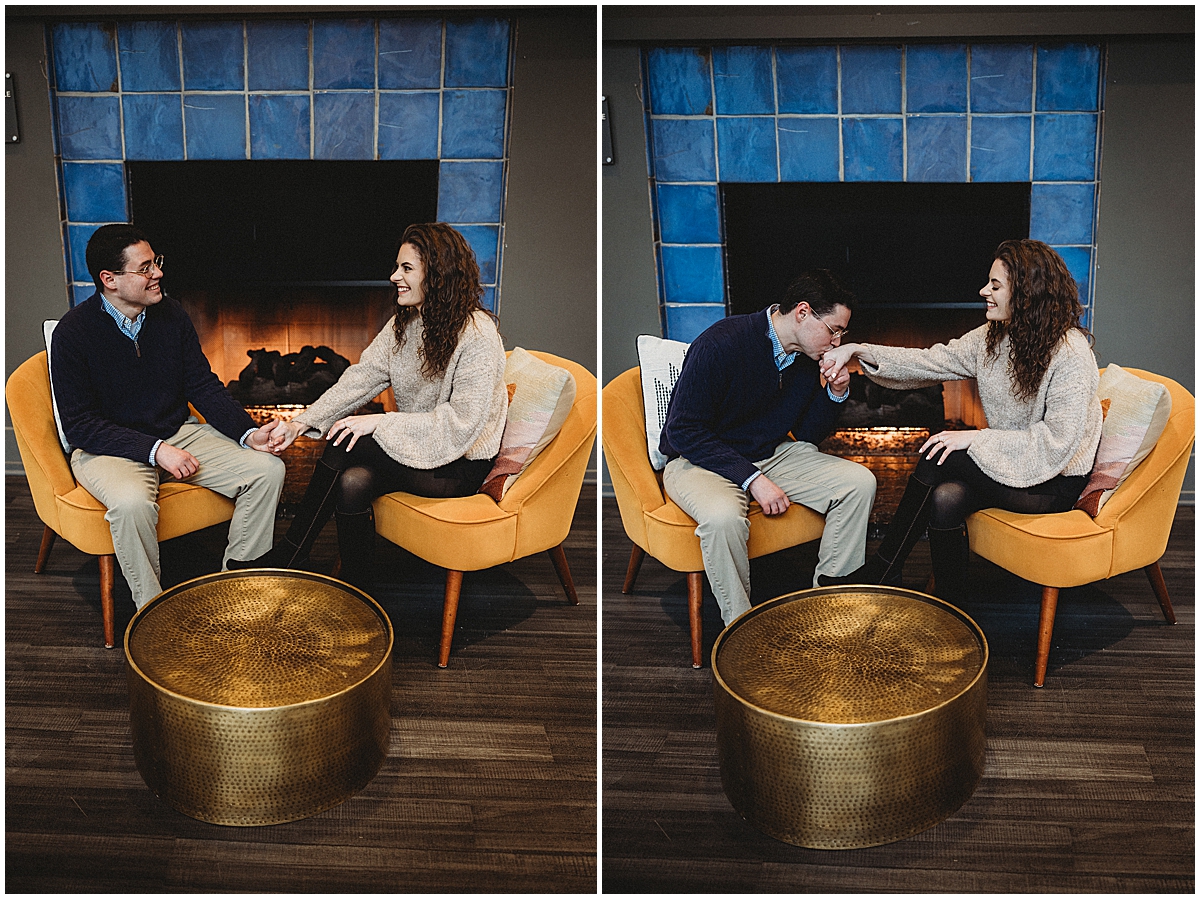 Thankfully, the storm held off long enough for us to capture everything safely. After the big moment, we stepped indoors near some beautiful artwork and grabbed a few extra portraits of this newly engaged couple. Warm. Cozy. Glowing.